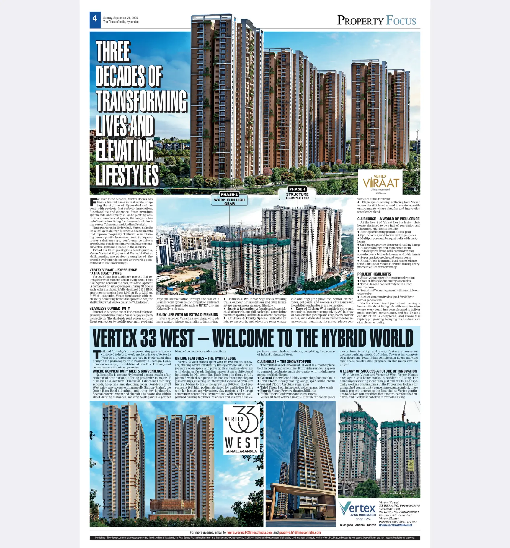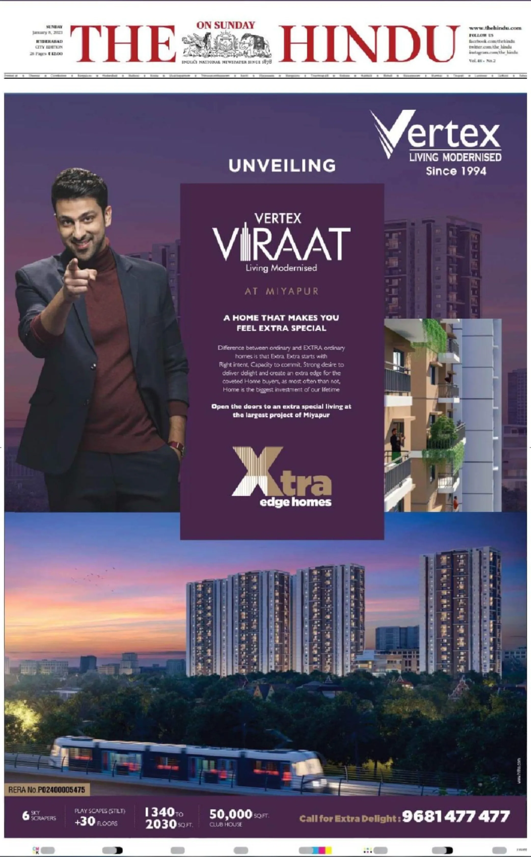 Vertex Homes, an established real estate development enterprise has been covered by reputed newspapers, channels, and magazines like Eenadu, Times Property, and The Hindu. Find our unique and compelling stories, updates on new projects, news about offers, etc. in various media across the state.